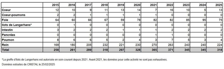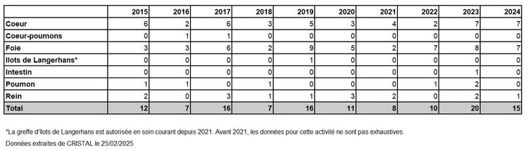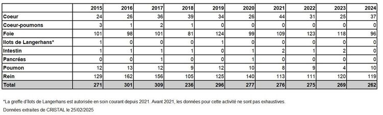Les greffes d’organes réalisées le plus couramment sur des receveurs inscrits avant l’âge de 18 ans sont la greffe rénale (133 greffes en 2024) et la greffe hépatique (100 greffes en 2024).