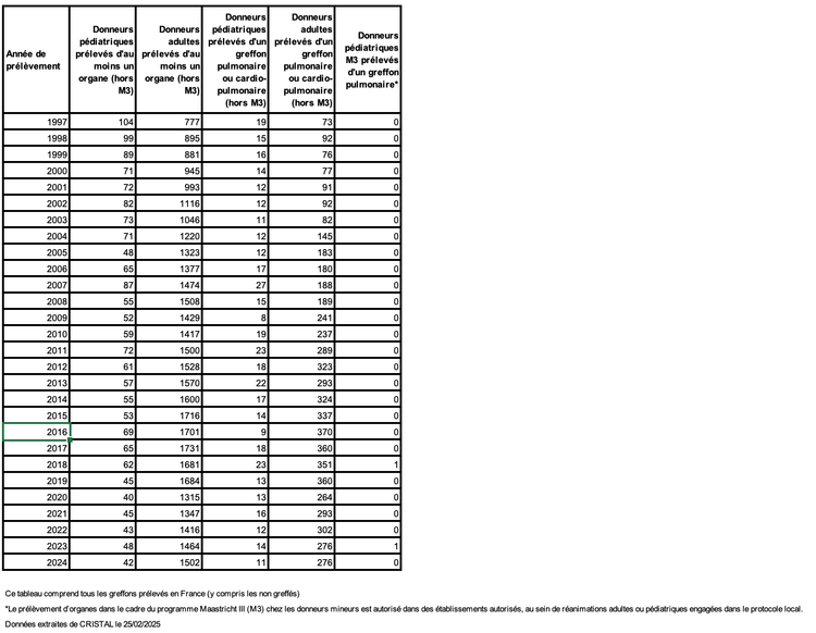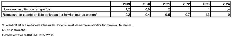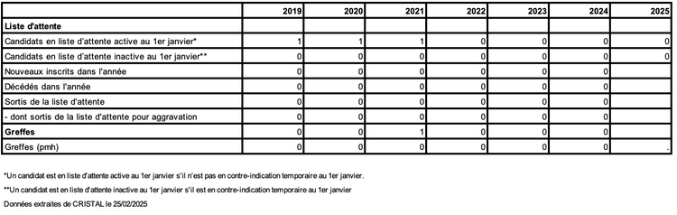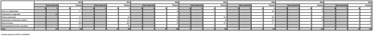 En 2024, il y a eu un prélèvement de greffon cardio-pulmonaire pédiatrique, greffé chez un adulte, aucune inscription en liste d’attente de greffe cardio-pulmonaire chez un enfant, ni aucune greffe cardio-pulmonaire pédiatrique.