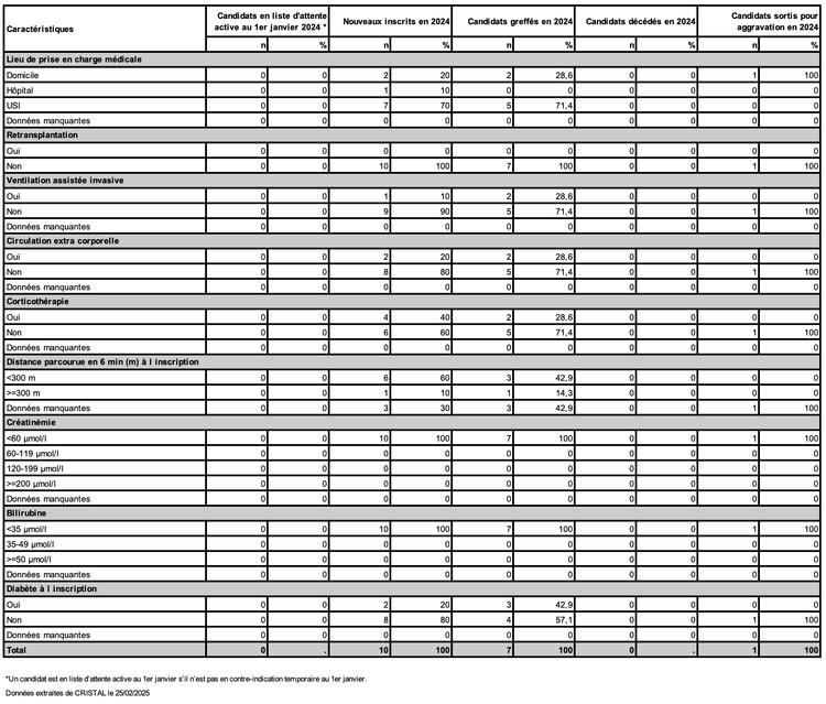 Tableau PedPCP4. Caractéristiques des candidats inscrits avant l'âge de 18 ans selon leur devenir en liste d'attente de greffe pulmonaire et cardio-pulmonaire en 2024