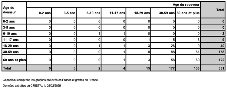 Tableau PedPCP8. Age des greffons pulmonaires et cardio-pulmonaires prélevés sur donneurs décédés et greffés en France en 2024 selon l'âge du receveur au moment de la greffe