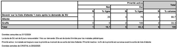 Tableau PedPCP10. Devenir des candidats pédiatriques inscrits en liste pulmonaire un mois après la première demande de SU effectuée et acceptée en 2024