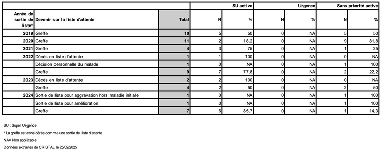 Tableau PedPCP11. Devenir des candidats selon la dernière priorité active par année de sortie de la liste d'attente de greffe pulmonaire (2019-2024)