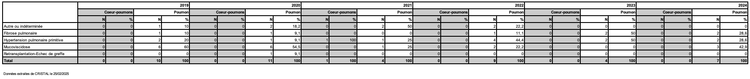 Tableau PedPCP5. Evolution du nombre de nouveaux candidats pédiatriques inscrits en attente d'une greffe pulmonaire ou cardio-pulmonaire selon l'indication