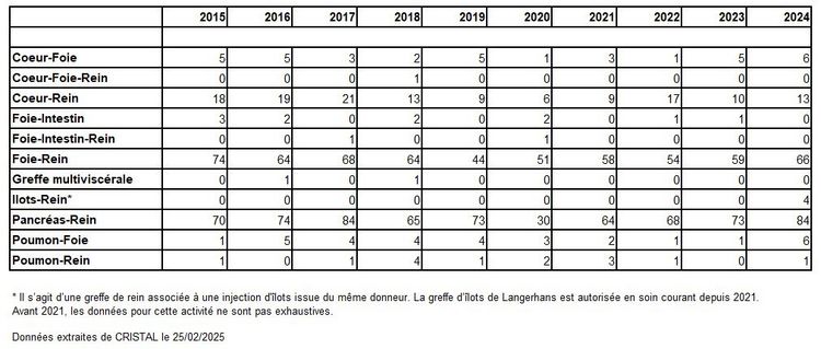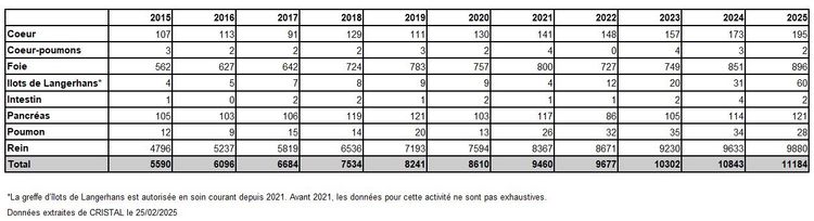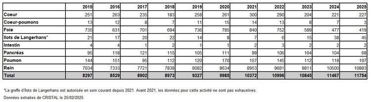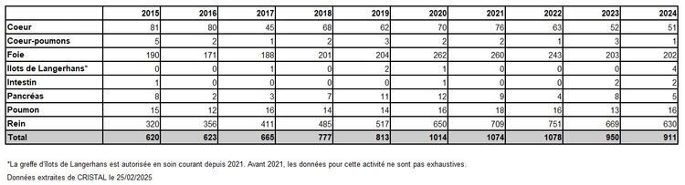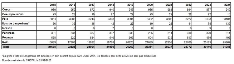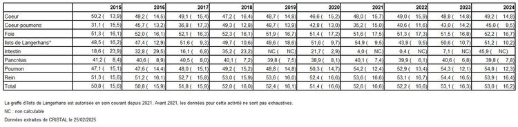 Ces chiffres sont présentés dans un tableau spécifique pour chaque organe.