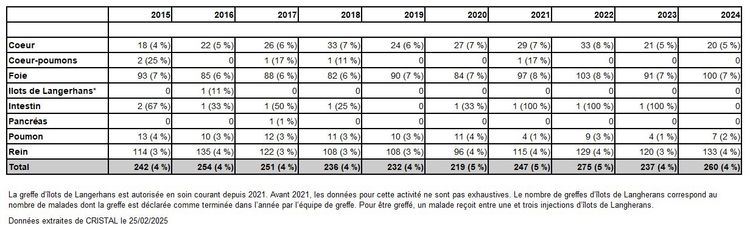Le nombre de greffes peut être utilisé comme indicateur d'activité de greffe. L’activité de greffe d’organes en 2024 est égale à 6054 dont 614 à partir de donneurs vivants.