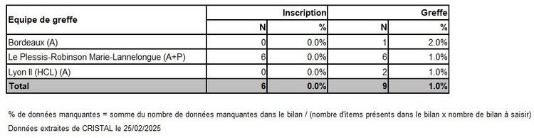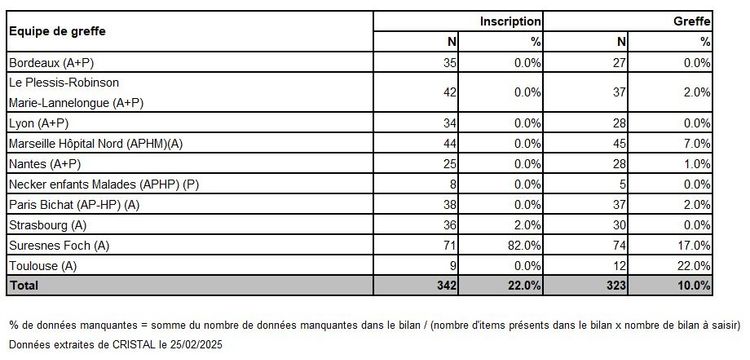 Dans le chapitre de greffe rénale, l’analyse de la non fonction primaire, de la reprise retardée de la fonction rénale et du débit de filtration estimé à 1 an se font en excluant les greffes des équipes qui ont plus de 30% de données manquantes pour ces indicateurs.