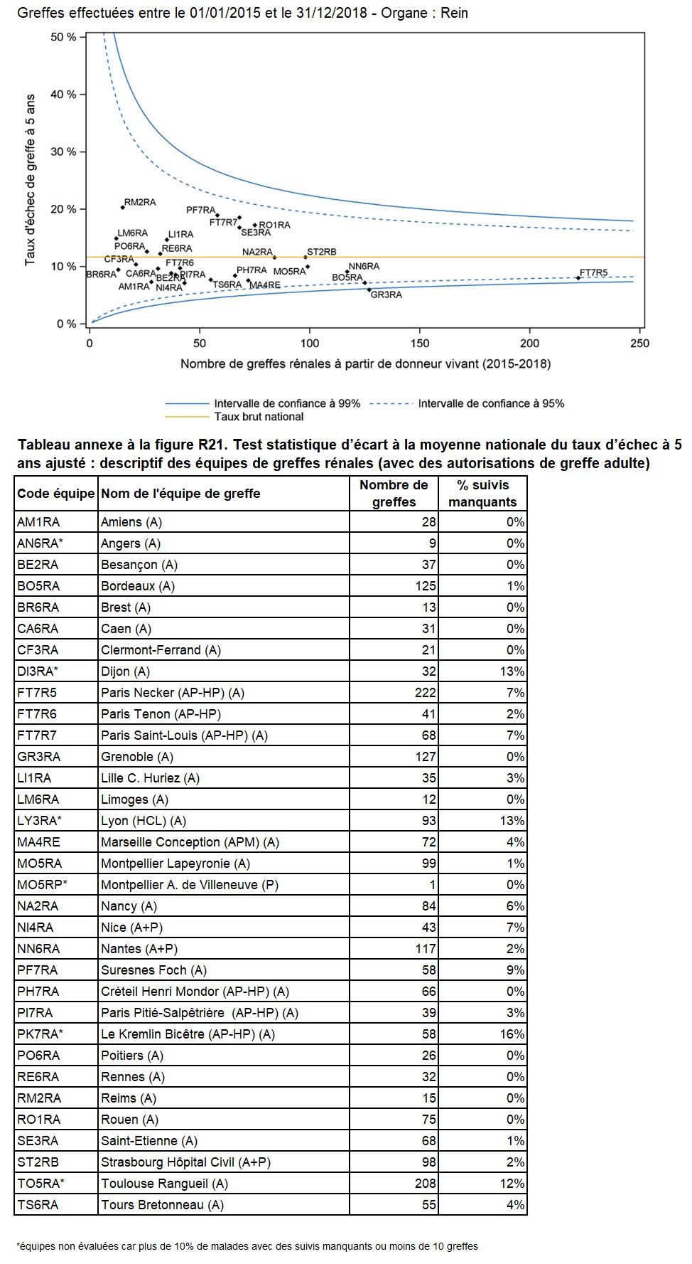 Cette année, aucune équipe n’a un taux d’échec de greffe à 5 ans significativement supérieur à la moyenne nationale et 1 équipe a un taux d’échec de greffe à 5 ans significativement inférieur à la moyenne nationale (Figure R21).