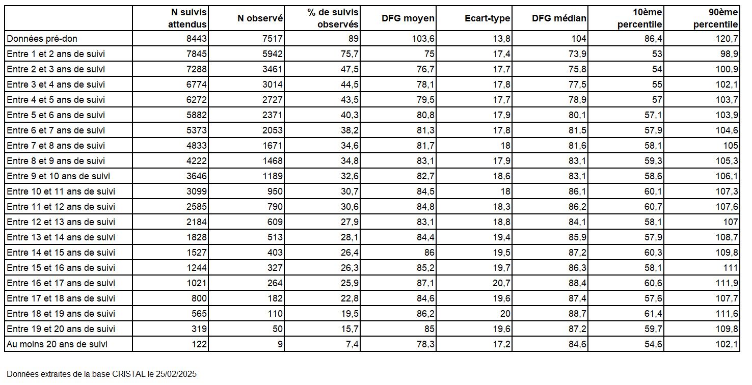 Tableau R42. DFG des donneurs vivants de rein selon le temps de suivi (débit de filtration glomérulaire estimé par la formule CKD-EPI) prélevés entre le 1er mai 2004 et le 31 décembre 2024