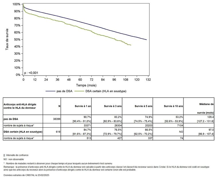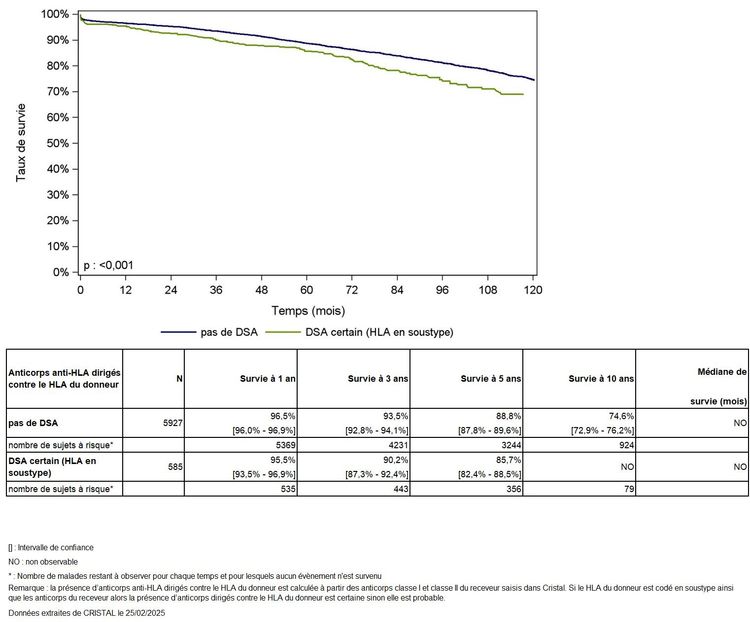 Figure R12. Survie du greffon rénal selon la présence d'anticorps anti-HLA dirigés contre le HLA du donneur (hors donneur vivant, donneur décédé après arrêt circulatoire, 2009-2023)