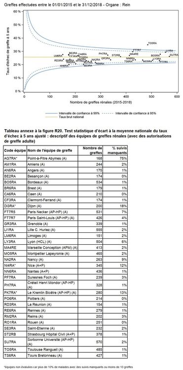 Figure R20. Test statistique d’écart à la moyenne nationale du taux d’échec à 5 ans ajusté pour les équipes de greffe rénale (avec des autorisations de greffe adulte) : méthode du « funnel plot »