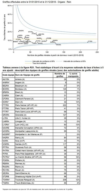 Les greffes suivantes sont exclues des analyses : greffes à partir de donneur vivant et de donneur décédé après arrêt circulatoire, greffes à partir de donneur étranger, greffes combinées, greffes effectuées par des équipes présentant 20% ou plus de perdus de vue.