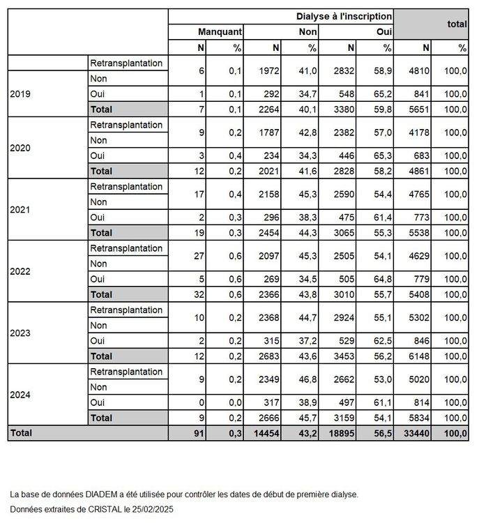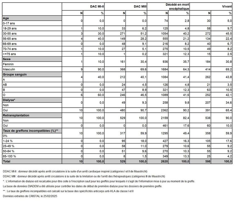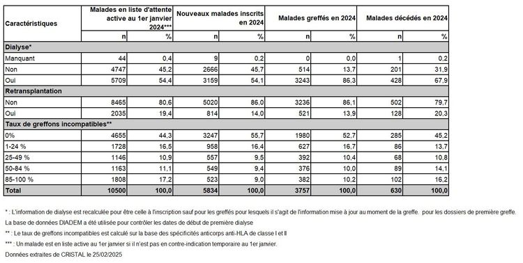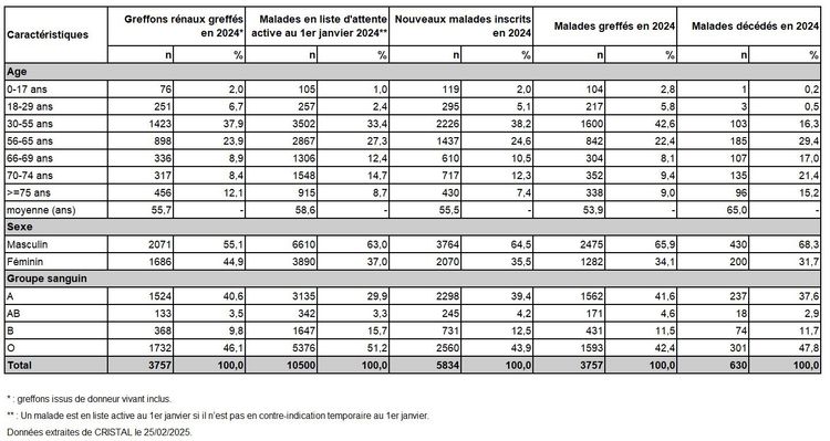 Tableau R3. Caractéristiques démographiques des donneurs de rein et des malades inscrits selon leur devenir en liste d'attente de greffe rénale en 2024