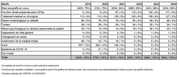 L’année 2024 est marquée par une moindre inscription de nouveaux malades (-5,1%) par rapport à 2023 mais la pénurie perdure et l’on observe une progression du nombre de malades en liste d’attente pour atteindre 10 883 malades en liste d’attente active au 1ier janvier 2025 (+3,6%). Les décès ou sortis de liste pour aggravation sont en recul (-8,1%) par rapport à 2023.