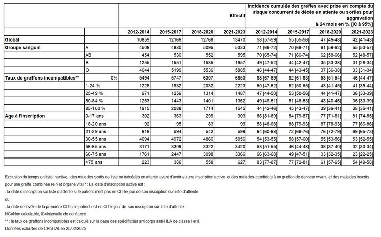 Le taux d’incidence cumulée de greffe rénale après une inscription active sur la liste nationale d’attente avec prise en compte des risques concurrents s’abaisse pour atteindre 42% à 2 ans pour la période d’inscription 2021-2023 (Figure R1). Les taux d’incidence cumulée de greffe rénale varient selon l’âge (les malades âgés de 66 à 75 ans ont les taux les plus bas), le groupe sanguin et le degré d’immunisation anti-HLA (défini par le taux de greffons incompatibles – TGI) (Tableau R12) et l’équipe de greffe (Tableau R14).