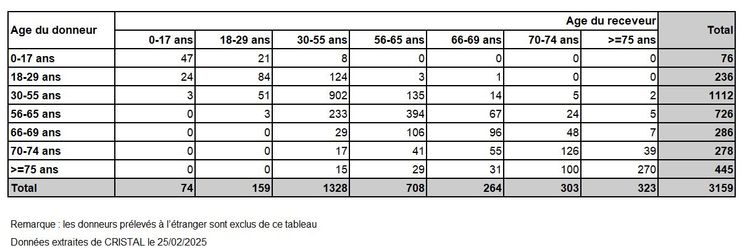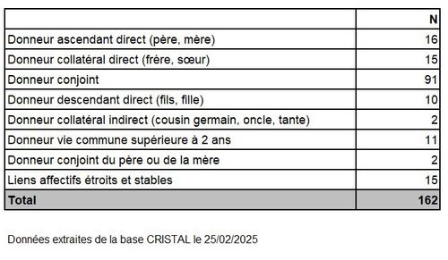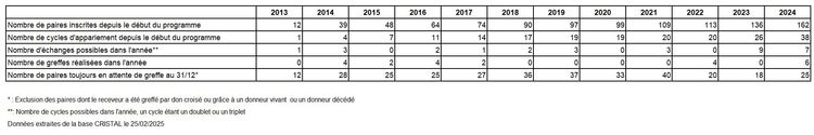 Malgré un nombre de paires inscrites dans le programme de don croisé qui reste faible (25 paires au 31/12/2024), 6 greffes de donneurs vivants compatibles ont été réalisées en 2024 via ce programme, avec pour la 1ière fois des échanges impliquant 3 paires.