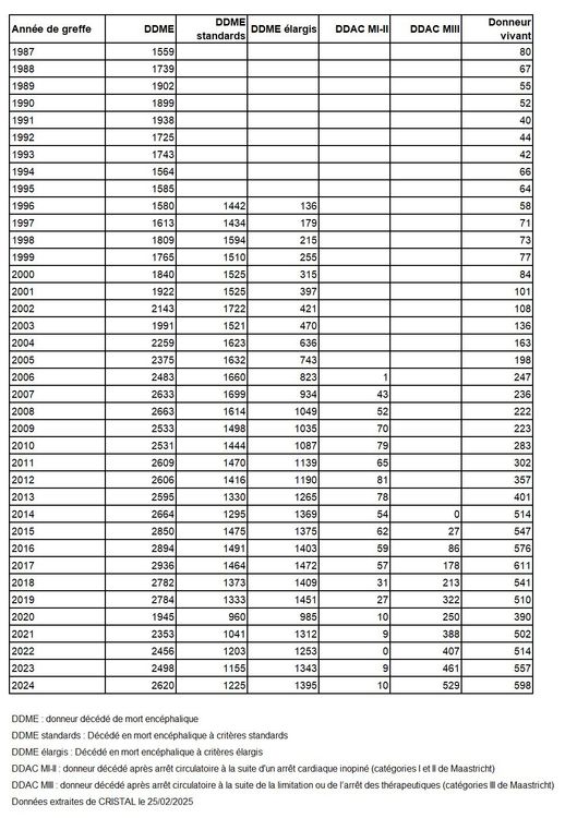 69,7% de donneurs décédés en état de mort encéphalique soit 2 620 greffes (+ 4,9% par rapport à 2023 soit + 122 greffes en 2024),