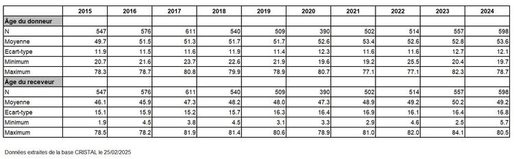 Tableau R37. Evolution de l'âge des donneurs et des receveurs depuis 2015 (donneurs de résidus opératoires et dominos exclus)