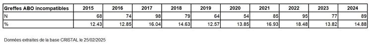 Tableau R38a. Evolution du nombre de greffes de rein à partir de donneur vivant ABO incompatibles entre 2015 et 2024