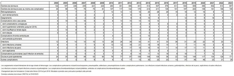 Tableau R40. Evolution de la fréquence des complications péri-opératoires chez les donneurs vivants de rein entre 2004 et 2023