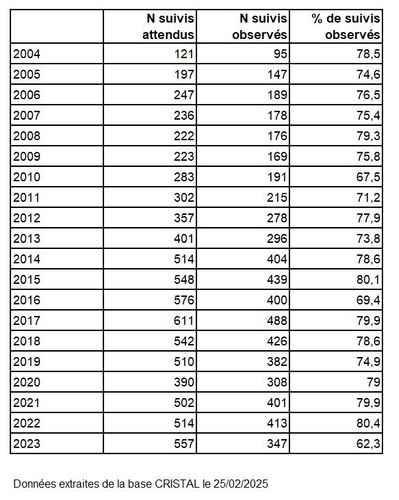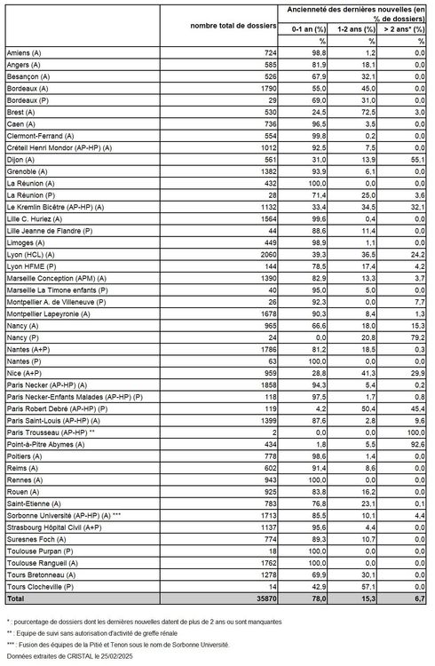 en fonction du délai écoulé depuis les dernières nouvelles : état de la base au 31 décembre 2024 des malades ayant eu une greffe rénale entre 2004 et 2023