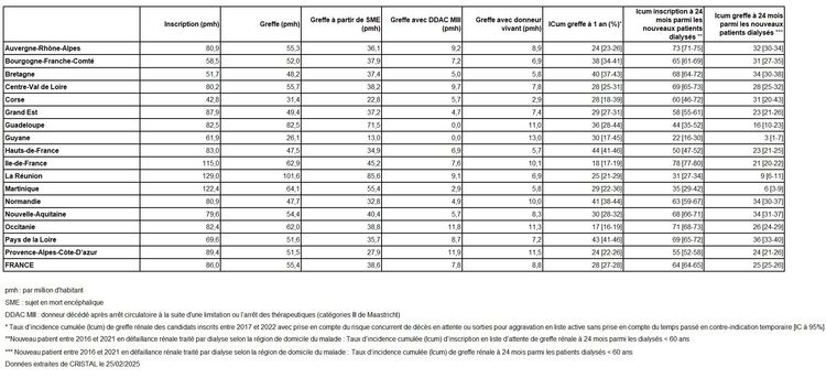 L’analyse régionale montre une activité d’inscription très élevée à La Réunion (129,0 pmh), Martinique (122,4 pmh) et Ile-de-France (115,0 pmh) (86,0 pmh au niveau national), avec un taux d’incidence cumulé d’inscription à 24 mois parmi les nouveaux dialysés de moins de 60 ans le plus élevé en Ile-de-France 78% et les plus faibles à Guyane (22%), La Réunion (31%) et Martinique (35%) (64% au national). L’activité de greffe est la plus élevée à la Réunion (101,6 pmh) et la plus faible en Guyane (26,1 pmh) (55,4 pmh au national). L’activité de greffe à partir de donneur en arrêt circulatoire de la catégorie III de Maastricht est la plus élevée en Provence-Alpes-Côte-d’Azur. L’activité de greffe à partir de donneur vivant est la plus élevée en Guyane (13,0 pmh). Le taux d’incidence cumulé de greffe à 24 mois parmi les nouveaux dialysés de moins de 60 ans est le plus élevé dans les Pays de la Loire (36%) (25% au national).
