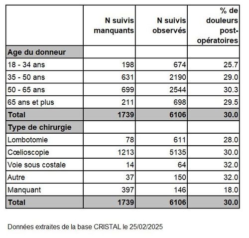 Tableau R39. Fréquence des douleurs post-opératoires après le prélèvement chez les donneurs vivants de rein selon l'âge et le type d'intervention entre 2004 et 2023